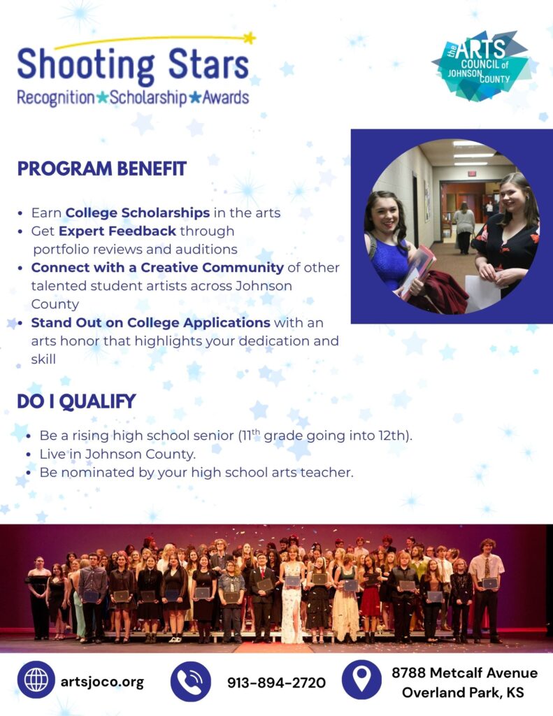 Students who participate in Shooting Stars, students must be a senior in high school (12th grade), a resident of Johnson County, KS and nominated by their high school arts teacher. After students are nominated and submit their completed application, they become Shooting Stars finalists.