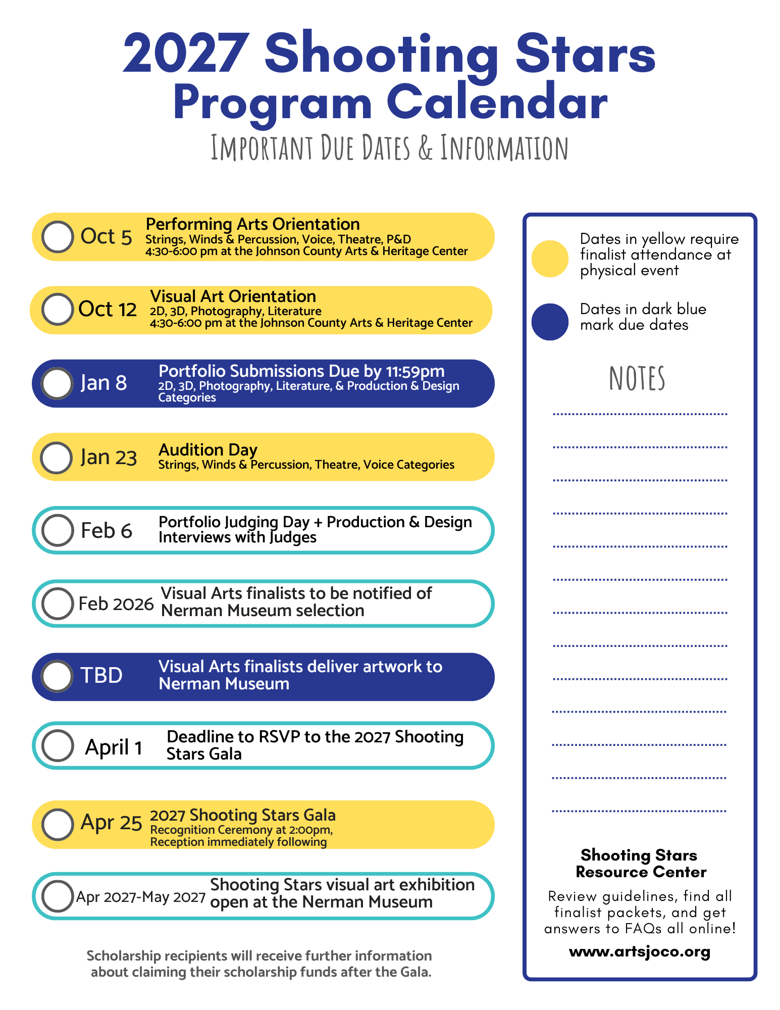 The Finalist Resource Center is a central place to find details about the Shooting Stars program. It includes links to the program calendar and scholarship guidelines. Finalist program packets, which are linked below, include detailed information about audition and portfolio submission requirements, deadlines, and the Shooting Stars Gala and Recognition Ceremony.